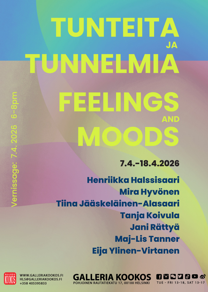 07.04.2026 - 18.04.2026 klo 18, Helsinki, Tapahtumainfo Tunteita ja Tunnelmia- Feelings and Moods Tunteita ja Tunnelmia- Feelings and Moods 7.4.-18.4.2026 Vernissage 7.4.2026 6-8pm Inhimilliset...